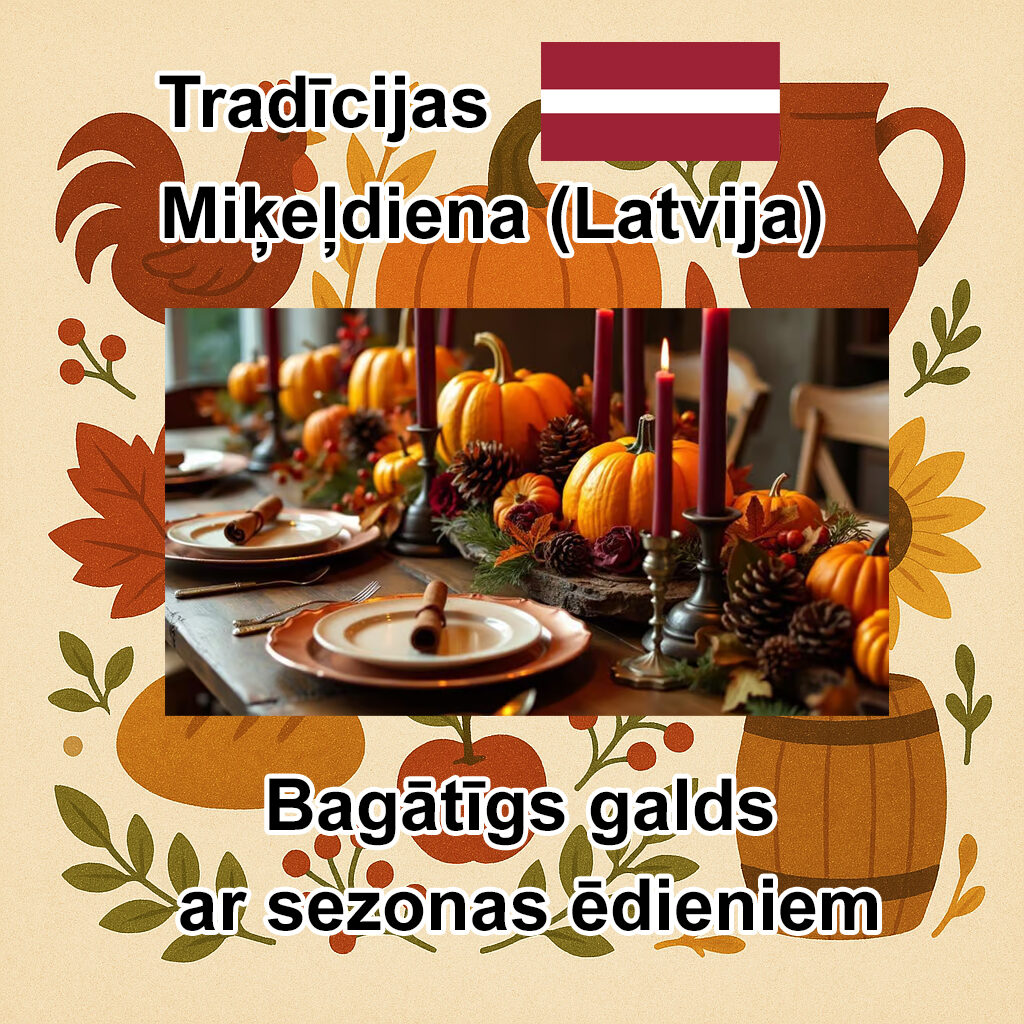 Bagātīgs galds ar sezonas ēdieniem – svētku galdā likti tieši rudens produkti: dārzeņi, augļi, graudi un sieru ražojumi. Šis mielasts simbolizē gan darba augļus, gan ģimenes kopību, un tas bieži tiek papildināts ar īpašiem, senām tradīcijām iedvesmotajiem ēdieniem.