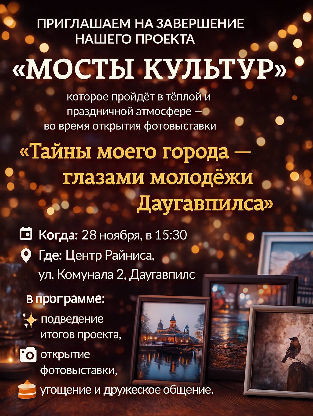 Приглашаем на завершение нашего проекта «Мосты Культур», которое пройдёт в тёплой и праздничной атмосфере — во время открытия фотовыставки