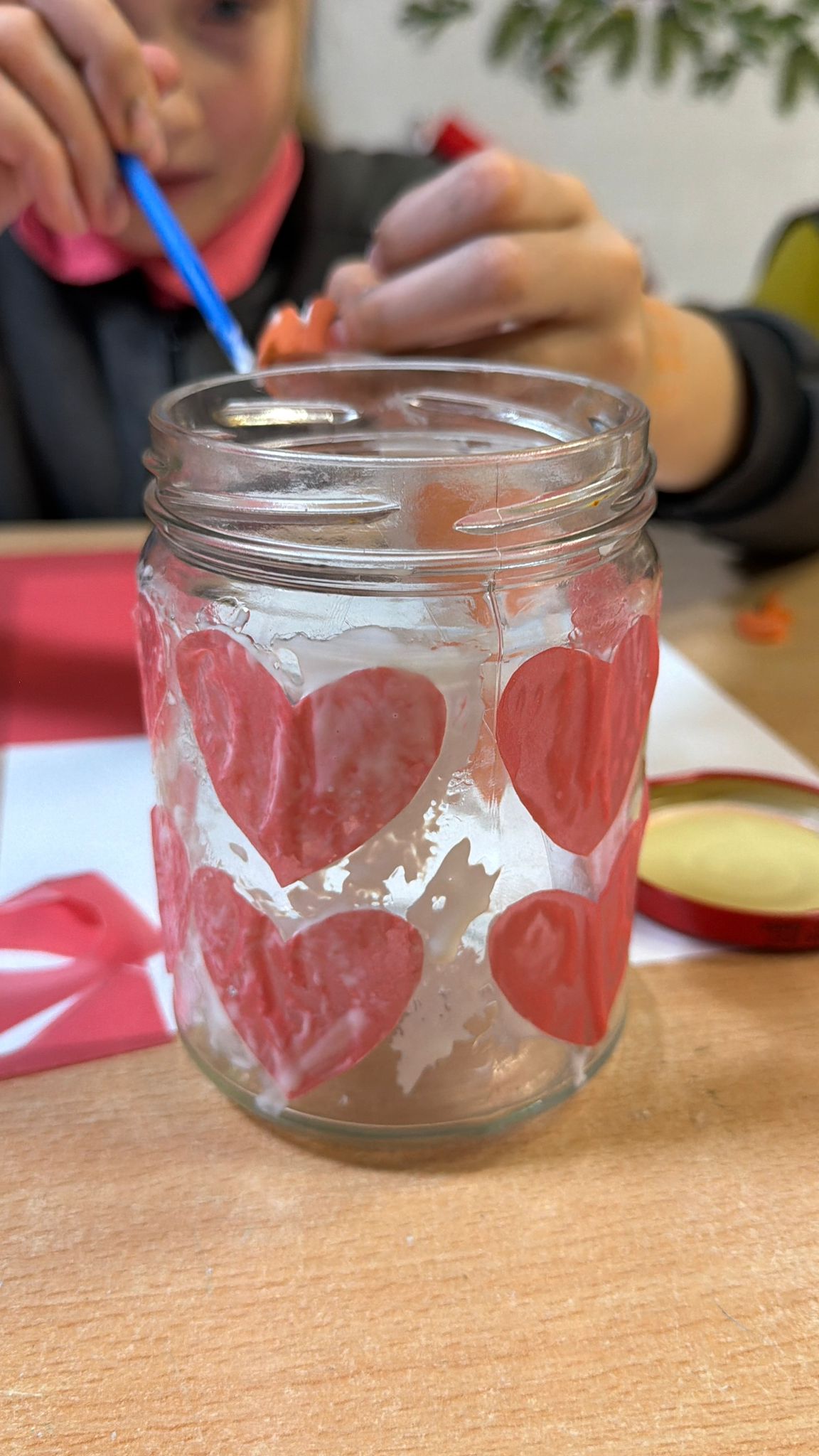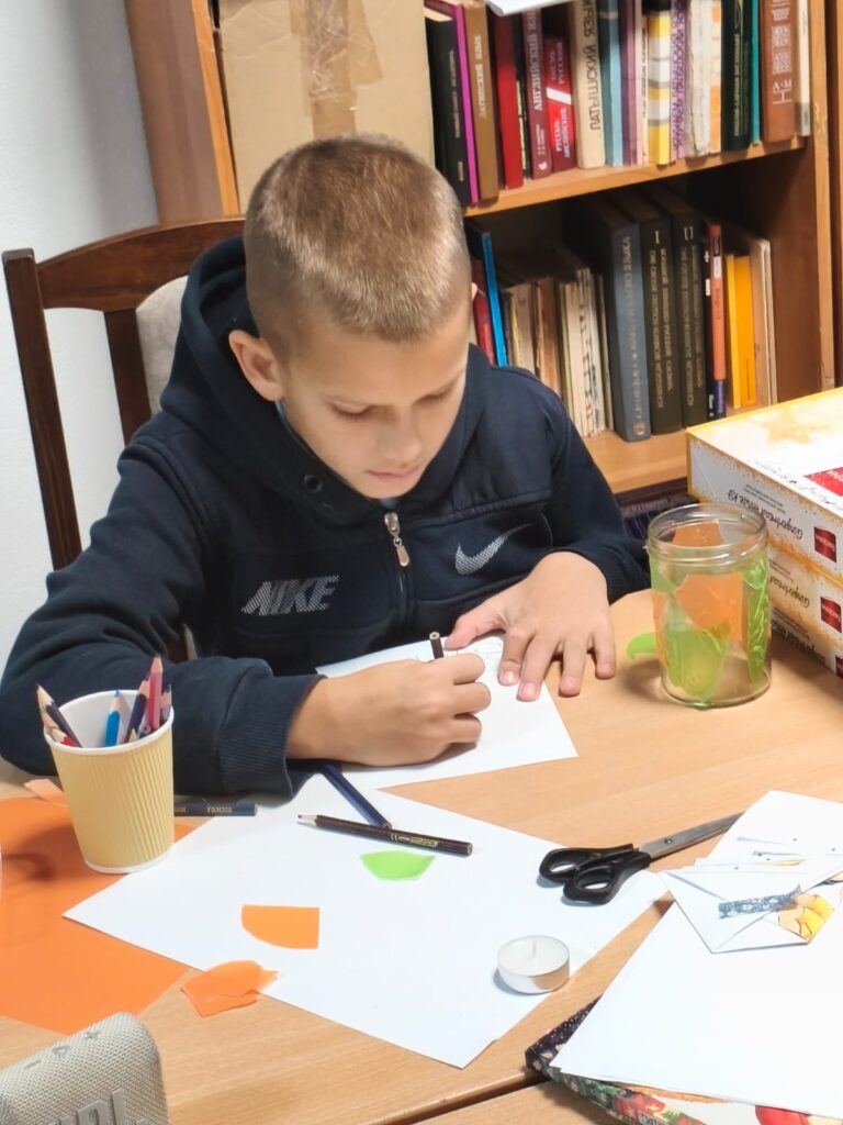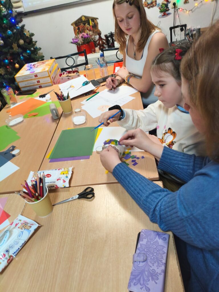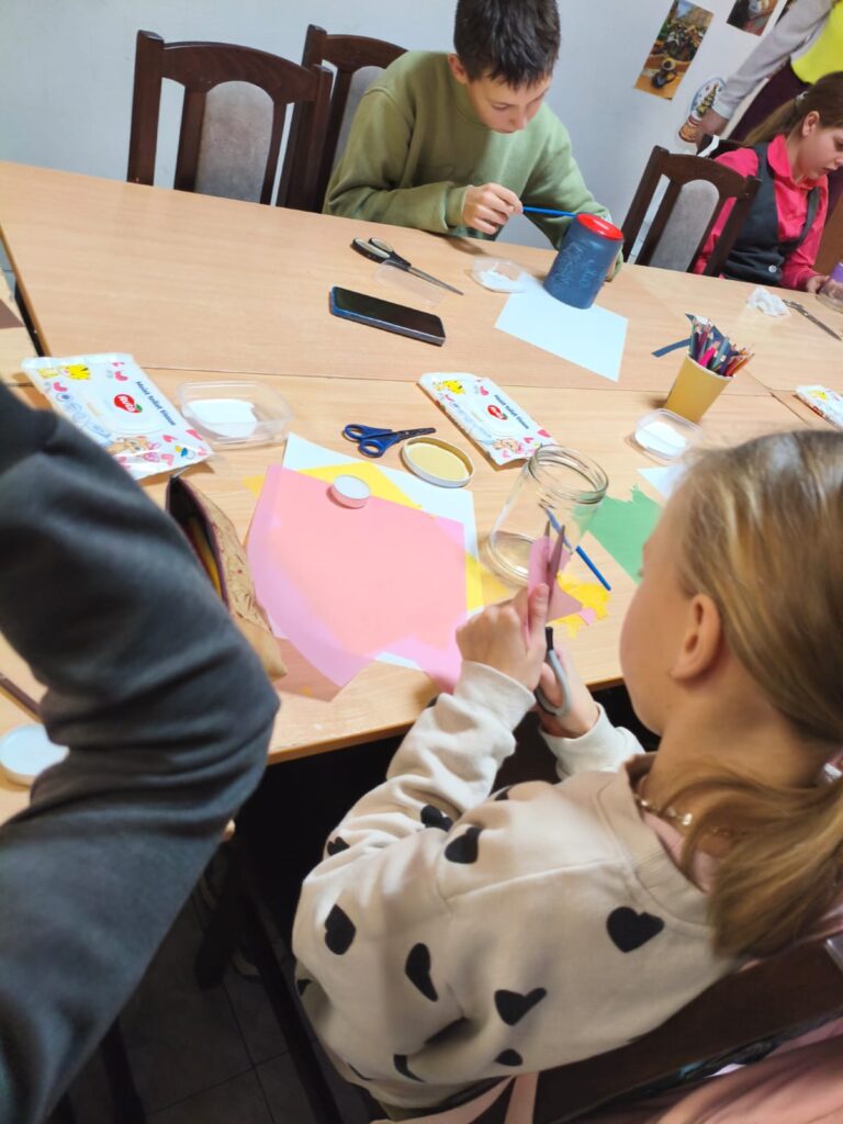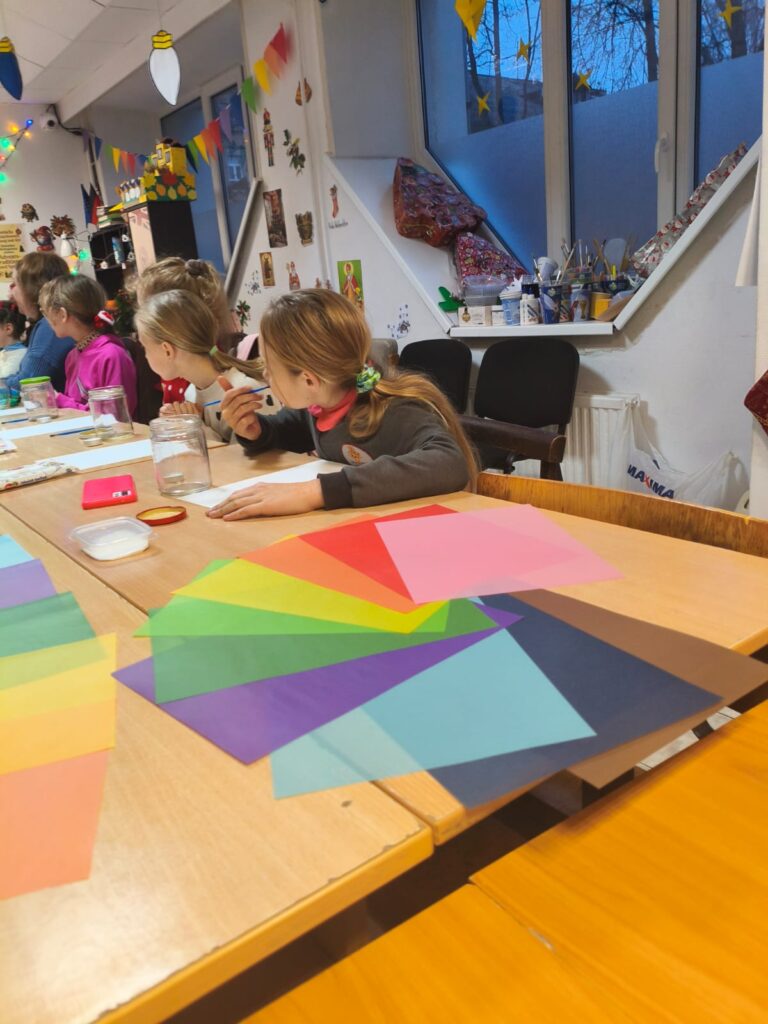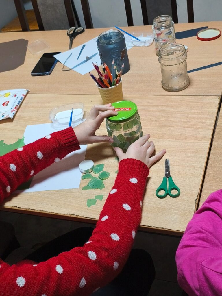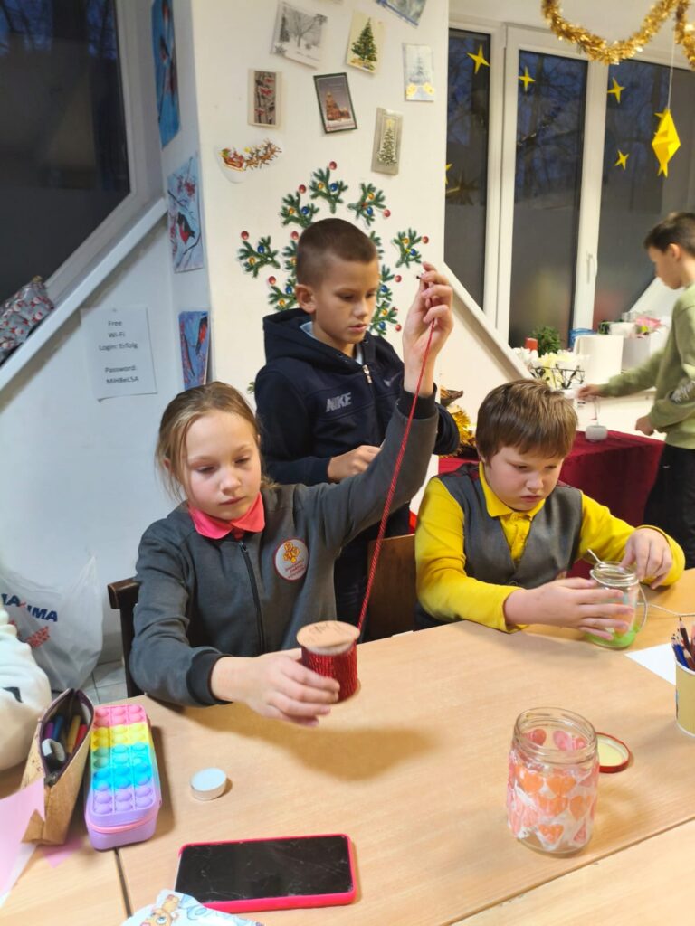 Главным творческим заданием стало создание ярких Windlichter — рождественских подсвечников. Дети декорировали принесённые баночки цветной прозрачной бумагой, клеем и шнуром, превращая их в маленькие огоньки зимнего уюта.