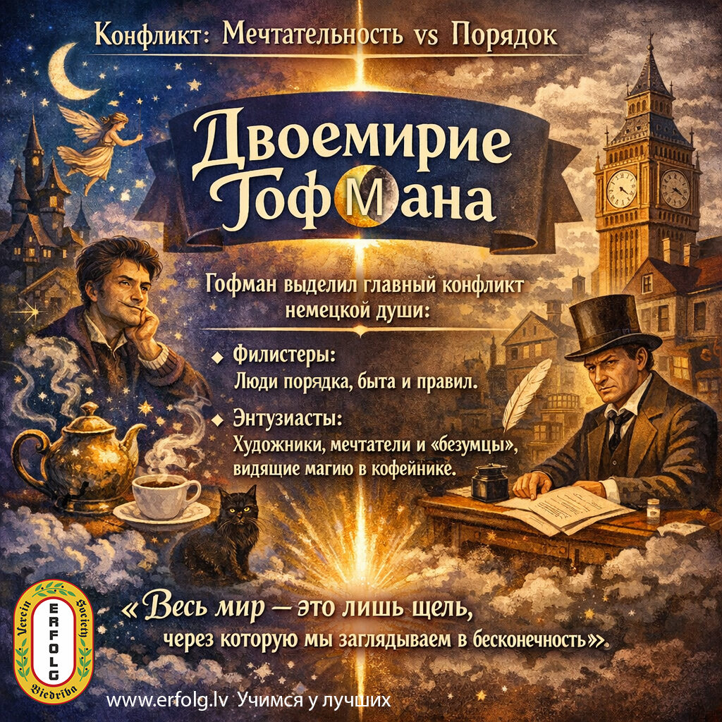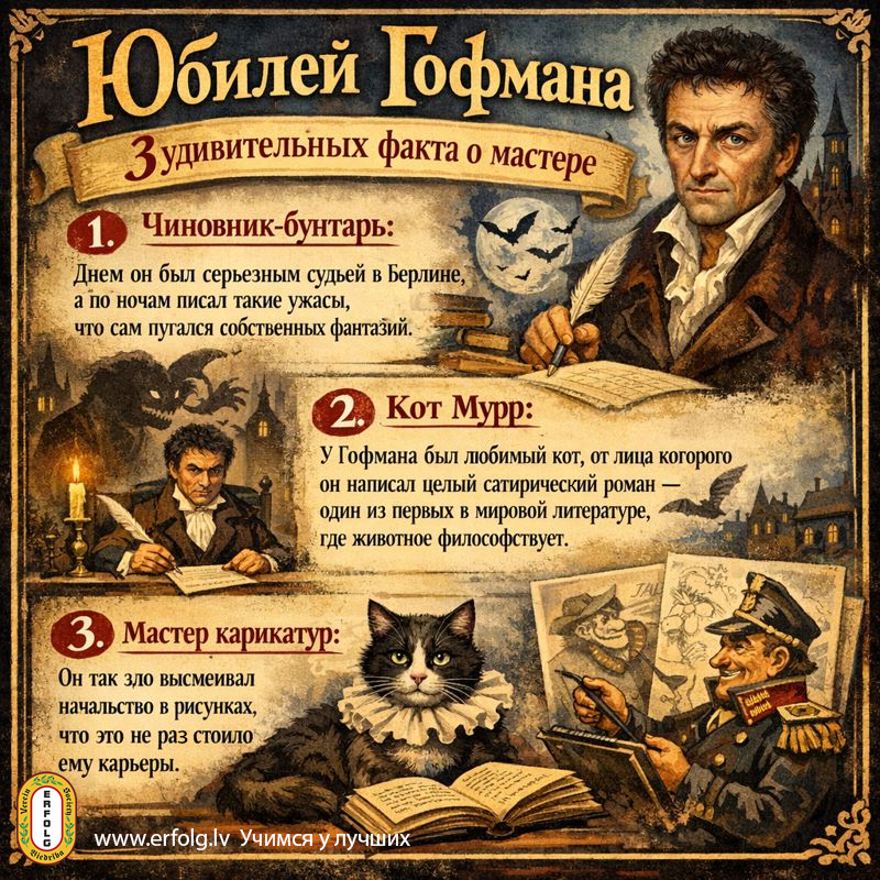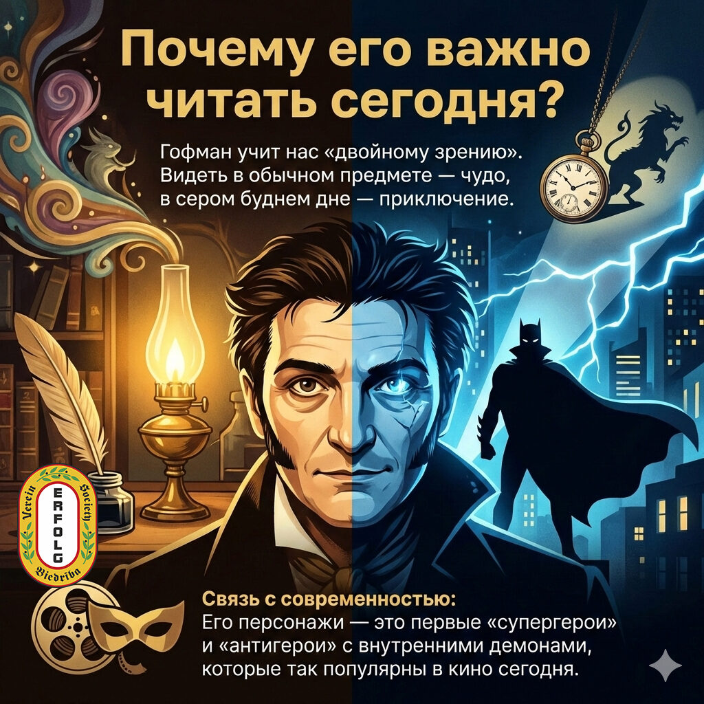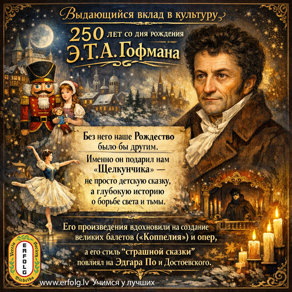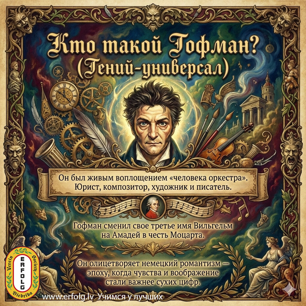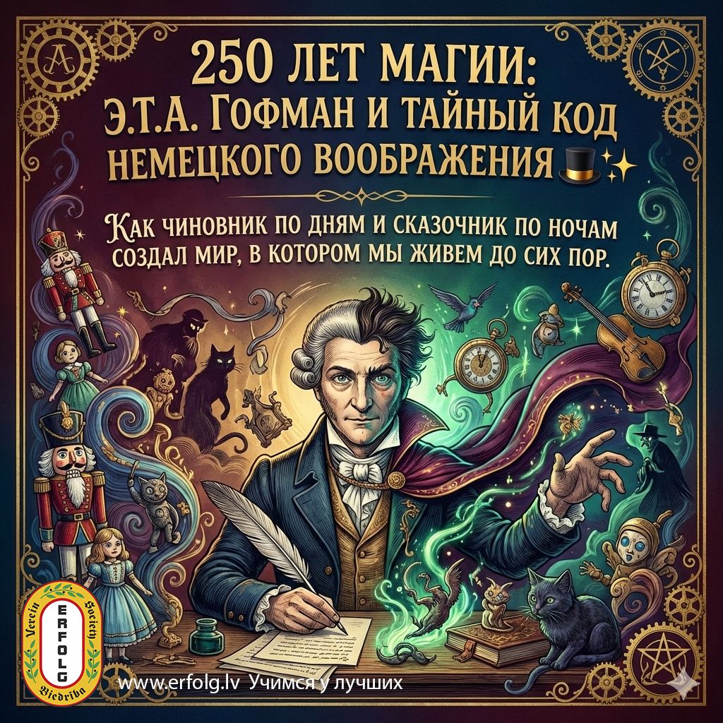 В ERFOLG мы любим такие даты: они открывают «внутренний код культуры». Гофман — идеальный проводник в немецкий романтизм, где реальность всегда имеет второе дно, а за будничной дверью может скрываться целая вселенная.