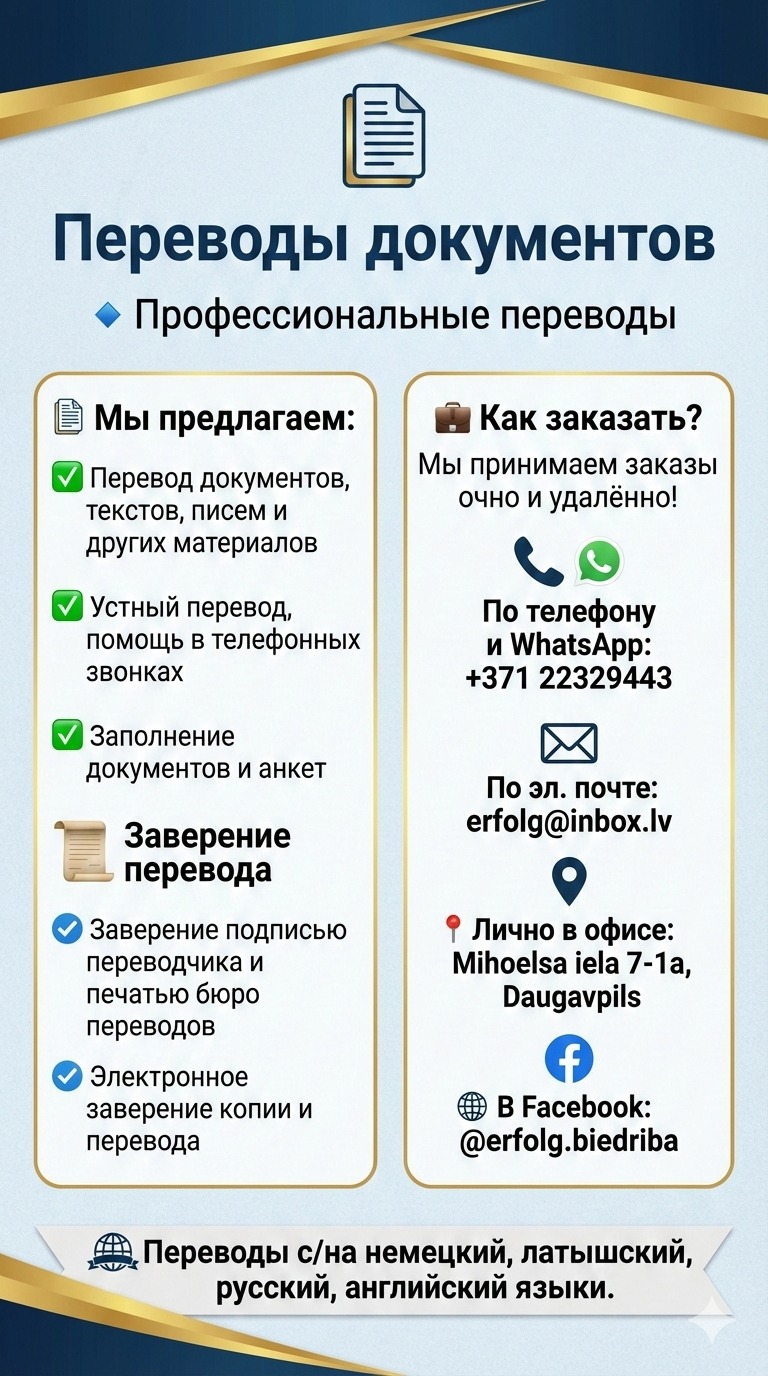 Переводы с/на немецкий, латышский, русский, английский языки.