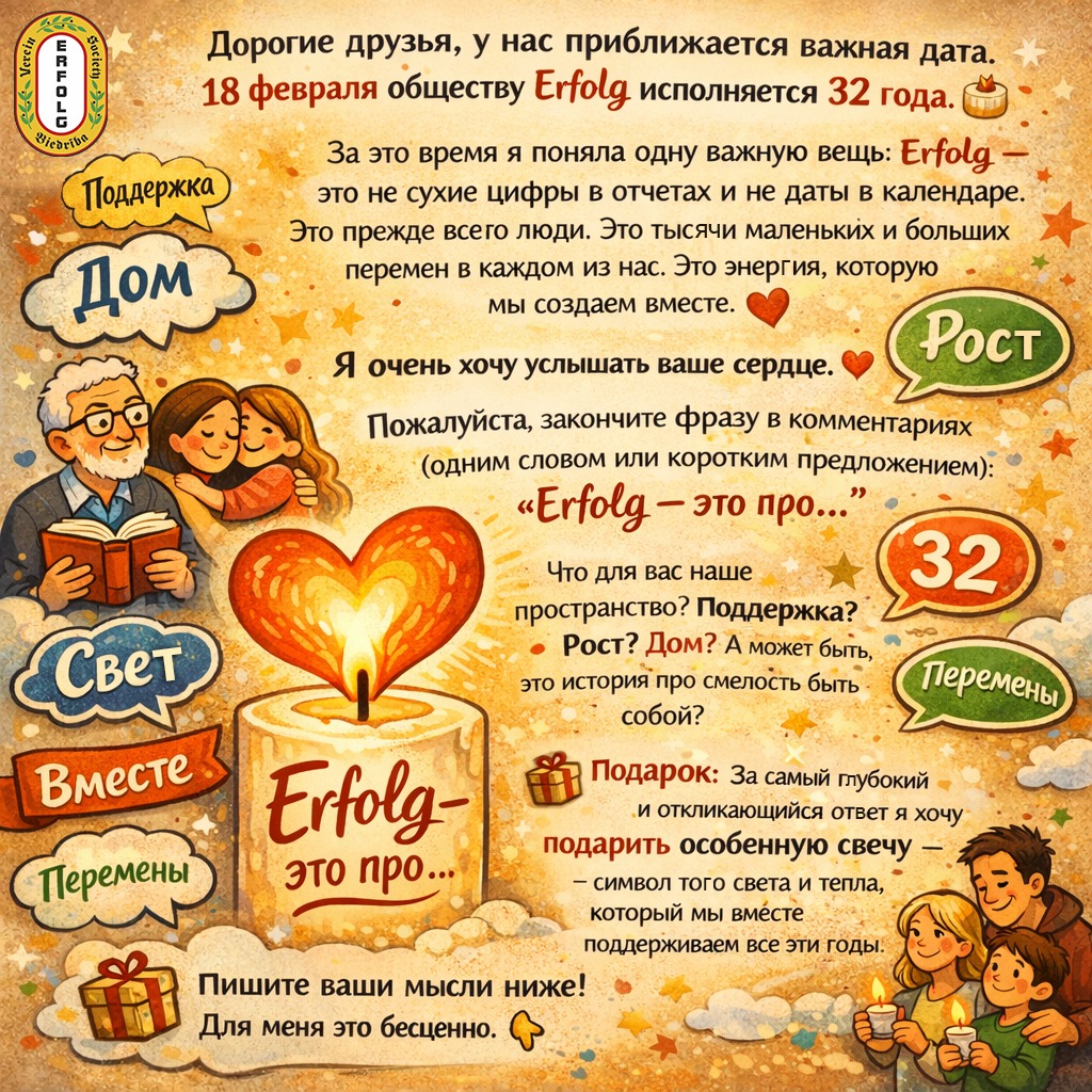 Приближается 18 февраля — день, когда нашему обществу исполняется 32 года. Это солидный возраст, за которым стоят тысячи событий. Но готовясь к этой дате, я осознала «Erfolg» — это не сухие цифры в отчетах и не даты в календаре.