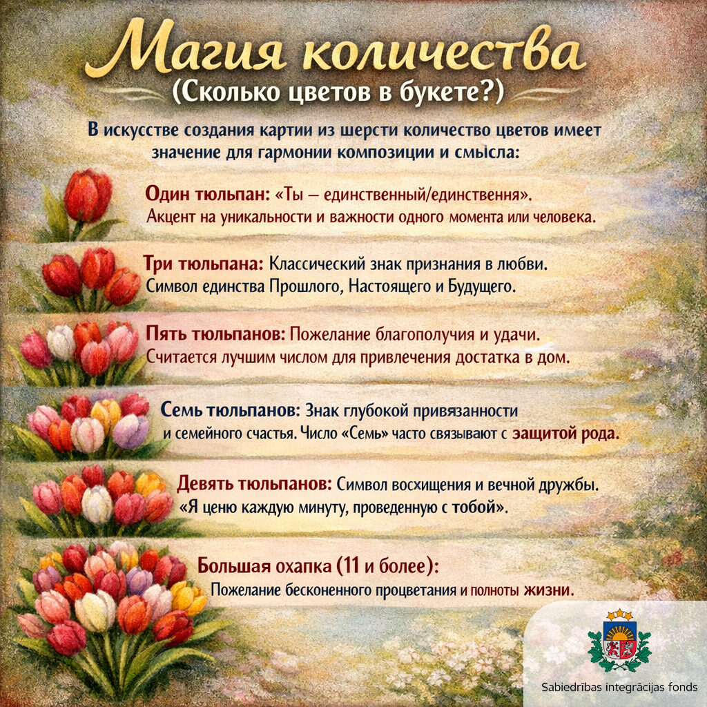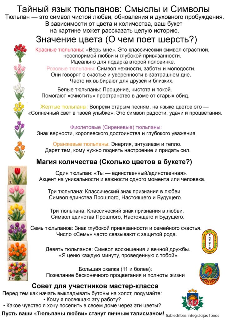 С большим успехом в нашем обществе прошел мастер-класс по рукоделию — мы создавали «Живопись шерстью Тюльпаны любви». Процесс выкладывания мягких волокон напоминает медитацию, но знаете ли вы, что каждый созданный вами бутон на холсте — это зашифрованное послание