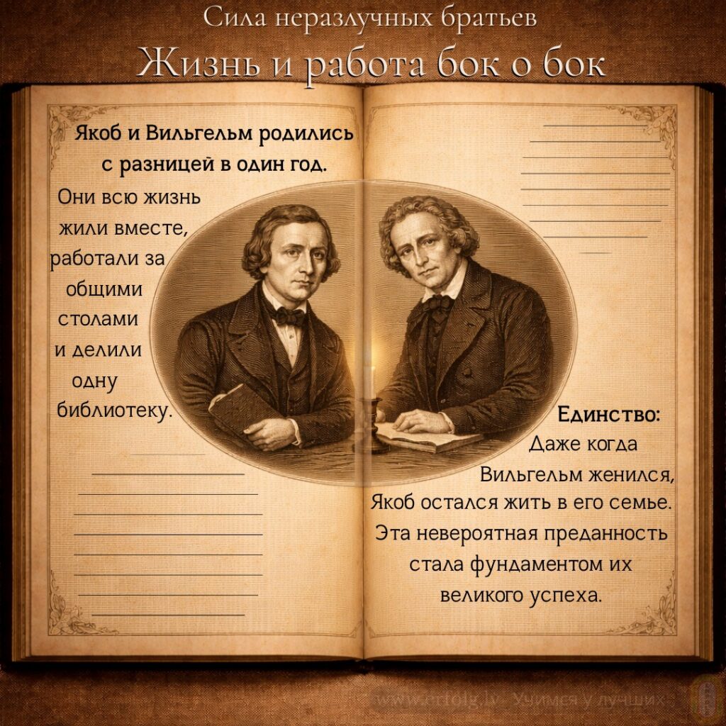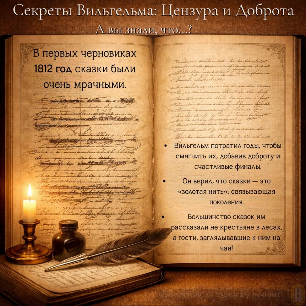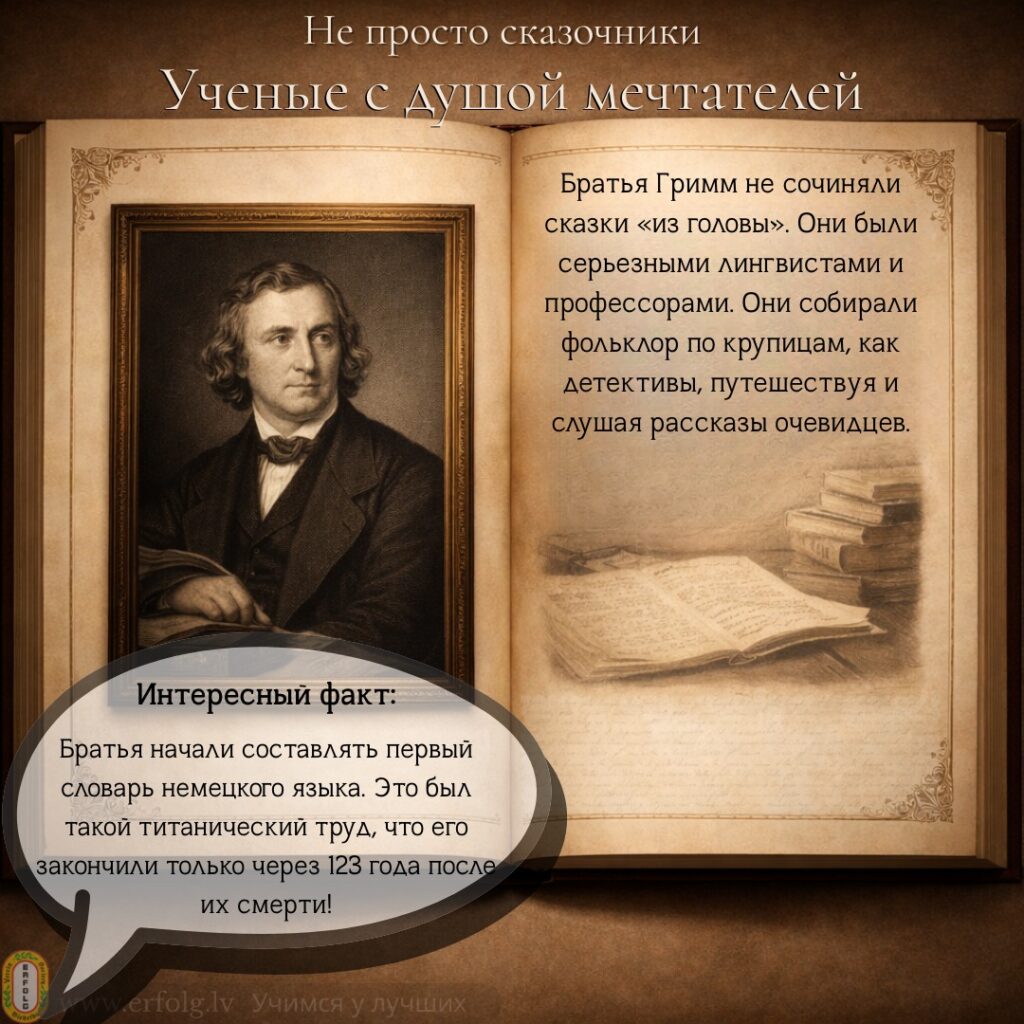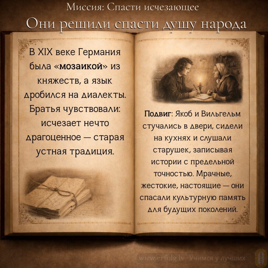 Вместе с братом Якобом он совершил невозможное: спас душу целого народа, записывая истории на кухнях обычных домов, пока те не стерлись из памяти. Они верили, что сказки — это не просто развлечение, а «золотая нить», связывающая поколения. ![]()