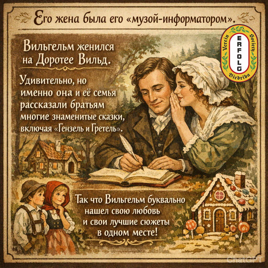 2️⃣ Любовь и фольклор Он нашел музу в лице соседки Доротее Вильд, ставшей его женой. Большинство сказок она рассказала ему в качестве будущей жены. Представляете такие свидания 😉