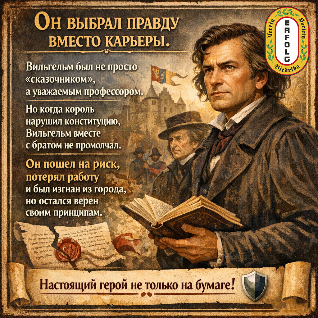 3️⃣ Честь превыше всего Был изгнан из Геттингена за защиту конституции. Он потерял работу профессора, но сохранил честь, выступив против несправедливости короля.